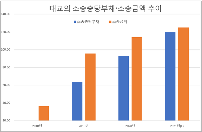대교의 소송충당부채는 63억5500만원(2019년)->92억9800만원(2020년)으로 해마다 급증하고 있다.