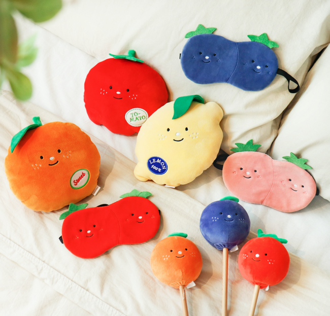 인형은 가지, 토마토, 당근 등의 디자인으로 사이즈는 두 가지이다. 주먹만한 사이즈의 ‘과일채소 동전지갑’과 ‘과일채소 안마봉’도 따뜻한 느낌의 원단을 함께 사용했다.