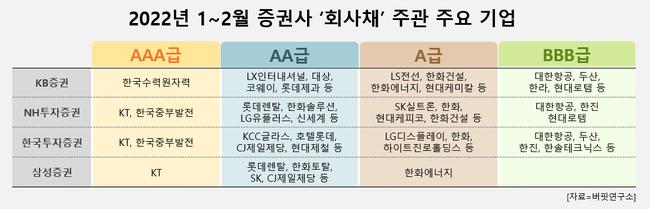회사채는 통상 'AAA'(원리금 지급능력 최고), 'AA'(원리금 지급능력 우수)부터 'D'(채무 불이행 상태)까지 10단계로 나뉜다. 국내 증권사들은 내부 리스크 정책에 따라 A등급 이상의 회사채를 주로 취급하기도 하고, BBB 이하를 취급하는 곳도 있다. 이번 기사에서는 AAA등급부터 BBB등급까지의 회사채 주관을 기준으로 했다.