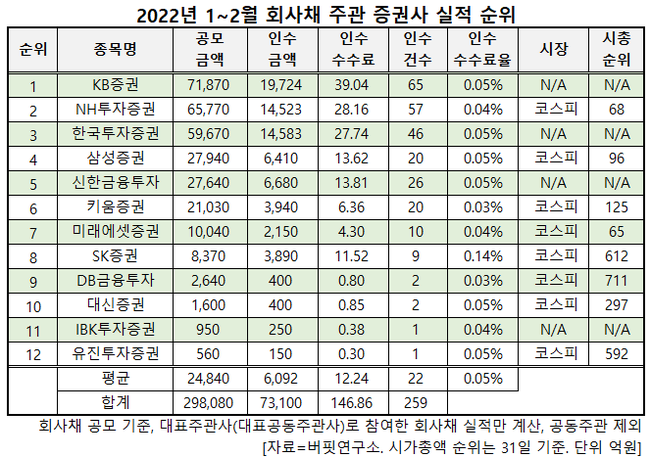 기업분석전문 버핏연구소 조사에 따르면 KB증권의 올해 1~2월 회사채 주관 공모금액은 7조1870억원으로 1위를 기록했다. 이어 NH투자증권(6조5770억원), 한국투자증권(5조9670억원), 삼성증권(2조7940억원) 등 순이다. 이번 회사채 실적 집계는 대표주관사와 대표공동주관사(공동주관사 제외)로 참여한 증권사의 공모금액을 기준으로 했다.