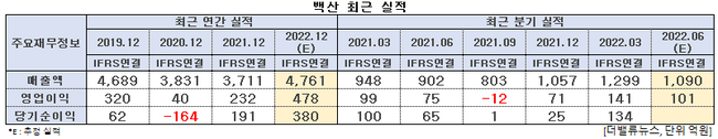 백산의 올해 매출액, 영업이익, 당기순이익은 각각 4761억원, 478억원, 380억원으로 전년비 28.29%, 106.03%, 98.95% 증가할 것으로 예상된다. 하나증권은 백산의 올해 매출액과 영업이익이 각각 4653억원, 472억원으로 전년비 25.4%, 103.4% 늘어날 것으로 봤다. 백산의 호실적 요인 중 주요 포인트는 차량용 합성피혁 매출 증가다. 차량용 합성피혁 매출액은 지난해 490억원에서 올해 720억원, 내년 1200억원으로 성장할 것으로 기대된다.