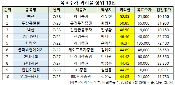 목표주가 괴리율 상위 10선. [이미지=더밸류뉴스]
