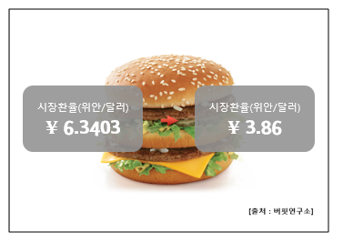 영국 경제전문지 이코노미스트의 「1월 빅맥지수(Big Mac Index)」 를 바탕으로 산출한 위안/달러 적정 환율(Implied Exchange Rate)은 3.86위안인 것으로 나타났다.