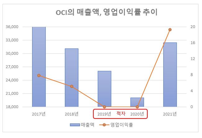 OCI는 2019년, 2020년 2년 연속 적자를 기록하다가 지난해 흑자 전환에 성공했다.