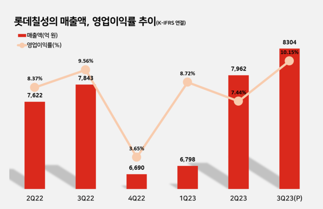 롯데칠성(대표이사 신동빈)이 3분기 매출액 8304억원, 영업이익 843억, 당기순이익 678억을 기록했다고 2일 공시했다(K-IFRS 연결). 전년동기대비 각각 5.9%, 12.3%, 45.2% 증가했다.