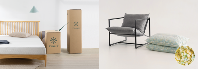 왼쪽부터 포장 박스 사이즈 축소, 생산 공정에서 발생한 부산물을 재활용한 제품. [사진=지누스]