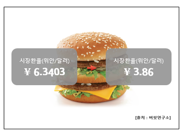 영국 경제전문지 이코노미스트의 「1월 빅맥지수(Big Mac Index)」 를 바탕으로 산출한 위안/달러 적정 환율(Implied Exchange Rate)은 3.86위안인 것으로 나타났다.