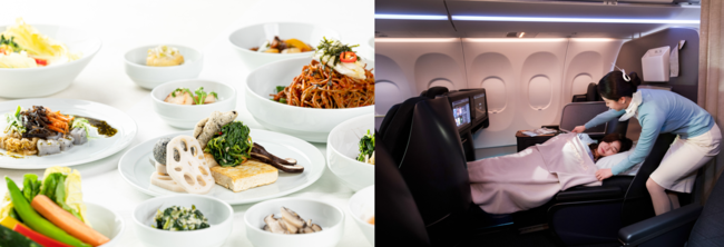 왼쪽부터 대한항공 한국식 비건 메뉴, 프레스티지 스위트. [사진=대한항공]‘글로벌 트래블러’는 2004년 창간한 미주 지역 항공·여행 전문 월간지로 구독자 50만명을 보유한 권위있는 매체로 매년 온·오프라인 구독자를 대상으로 설문조사를 실시해 각 분야별 항공사 순위를 발표한다.