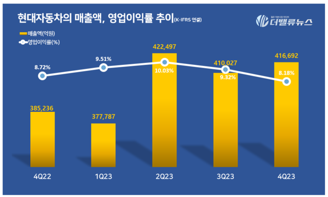현대자동차(이하 현대차, 대표이사 이동석 장재훈)가 지난해 4분기 매출액 41조6692억원, 영업이익 3조4078억원, 당기순이익 2조2026억원을 기록했다고 25일 공시했다(이하 K-IFRS 연결). 전년동기대비 각각 8.3%, 0.2%, 28.8% 증가했다. 북미 및 유럽, 인도 등 주요 지역의 견조한 판매 성장세를 바탕으로 외형 확대에 성공했고, 판매대수 증가 및 고부가가치 차종 중심의 믹스 개선으로 영업이익 성장세를 이어간 것으로 보인다.