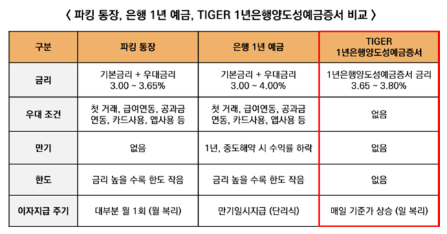 아울러 "일반 정기예금의 경우, 중도 해약시 약정액의 일부만 지급해 실질 수익률은 고시된 금리보다 낮은 경우가 일반적이지만, ‘TIGER 1년은행양도성예금증서액티브(합성) ETF’는 중도환매 수수료가 없어 하루만 투자해도 1년 정기예금 수준의 금리 수익을 얻을 수 있다"고 언급했다.