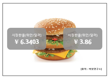 영국 경제전문지 이코노미스트의 「1월 빅맥지수(Big Mac Index)」 를 바탕으로 산출한 위안/달러 적정 환율(Implied Exchange Rate)은 3.86위안인 것으로 나타났다.
