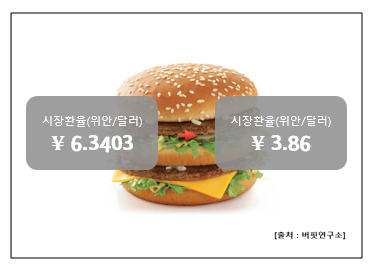 영국 경제전문지 이코노미스트의 「1월 빅맥지수(Big Mac Index)」 를 바탕으로 산출한 위안/달러 적정 환율(Implied Exchange Rate)은 3.86위안인 것으로 나타났다.