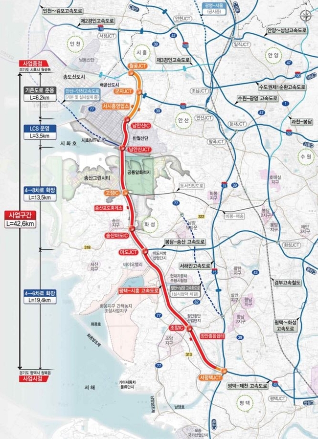 현재 왕복 4차로로 운영 중인 평택–시흥 고속도로는 이번 사업을 통해 6~8차로로 확장된다. 서평택JCT(분기점)에서 마도JCT까지는 6차로로, 마도JCT에서 남안산JCT까지는 8차로로 각각 확장되며 총 공사 기간은 60개월이 소요될 예정이다.