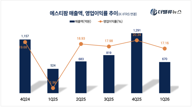 에스티팜 최근 분기별 매출액 및 영업이익률 추이. [자료=더밸류뉴스]