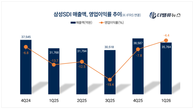 삼성SDI(대표이사 최주선)이 올해 1분기 실적으로 매출액 3조5764억원, 영업손실 1556억원을 기록했다고 28일 밝혔다(K-IFRS 연결). 전년 동기 대비 매출액이 12.6% 증가했고, 영업손실 규모는 64.2% 줄었다. 당기순이익은 561억원을 내며 흑자 전환에 성공했다.