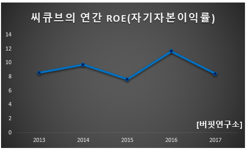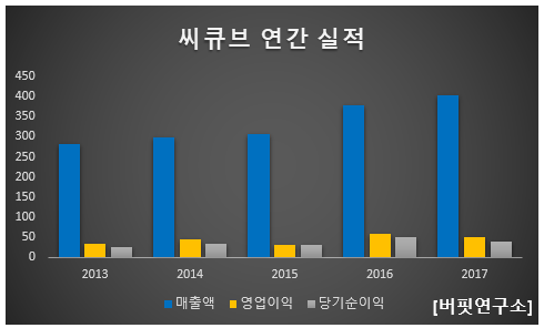 씨큐브의 영업이익률은 9.90%(2015년), 15.01%(2016년), 12.36%(2017년)로 10% 안팎을 유지하고 있다. ROE(자기자본이익률)도 7.63%(2015년), 11.64%(2016년), 8.42%(2017년)으로 마찬가지로 두자리수를 유지하고 있다. 충북 진천에 본사를 두고 있는 강소 기업이 아모레퍼시픽, LG생활건강 같은 국내 화장품 업체 뿐만 아니라 로레알, 에스티로더를 비롯한 해외 유명 기업에 안료를 공급하면서 독보적 경쟁력으로 양호한 수익을 내고 있는 것이다.