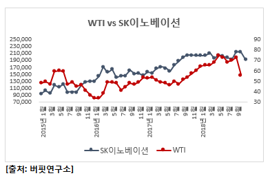 SK이노베이션은 석유개발 및 석유사업부문, 화학사업부문, 윤활유사업부문 등 석유 관련의 사업을 영위하고 있기 때문에, 2016년 이후로는 SK이노베이션이 주로 사용하는 원유인 WTI의 가격이 올라가면 석유가도 올라 실적이 개선되는 양상을 보인다.