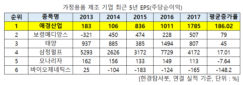 한경탐사봇이 가정용품 제조 기업들의 2013~2017년 실적을 바탕으로 EPS를 탐색한 결과 평균 증가율 1위는 애경산업(018250)(186.02%)이었다. 이어 보령메디앙스(014100)(79%), 태양(053620)(45%), 삼정펄프(009770)(17.01%), 모나리자(012690)(-7.64%), 바이오제네틱스(044480)(-148.2%)가 뒤를 이었다.