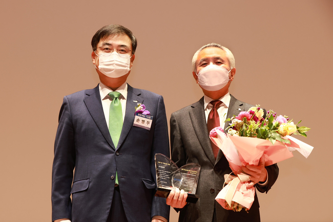 박종복(오른쪽) SC제일은행장이 지난 3일 서울 여의도 한국거래소 본관 컨퍼런스홀에서 손병두 한국거래소 이사장과 '2021 KCGS 지배구조 우수기업 시상식'에서 기념촬영하고 있다. [사진=SC제일은행]
