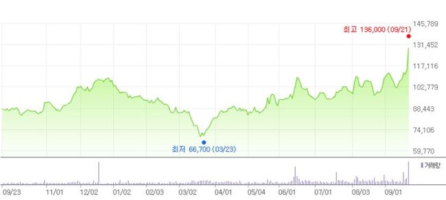 동아쏘시오홀딩스 최근 1년 주가 추이. [사진=더밸류뉴스(네이버 금융 제공)]