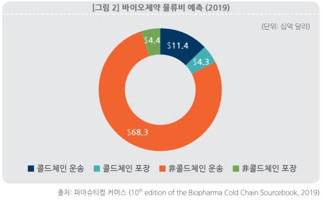 지난해 12월 한국바이오협회에 따르면 2019년 글로벌 바이오 제약 전체 물류비 880억달러(약 102조원) 중 콜드체인 물류비는 157억달러(약 18조원)로 잠정 집계됐다. 이는 150억 달러(약 17조원)를 기록한 전년비 약 4.5% 증가한 수치다. 바이오 제약 산업에서 콜드체인 물류비는 지속적으로 빠르게 증가하고 있다.